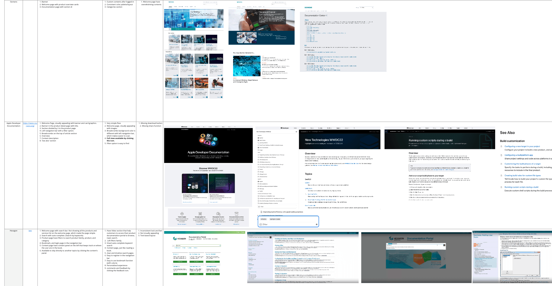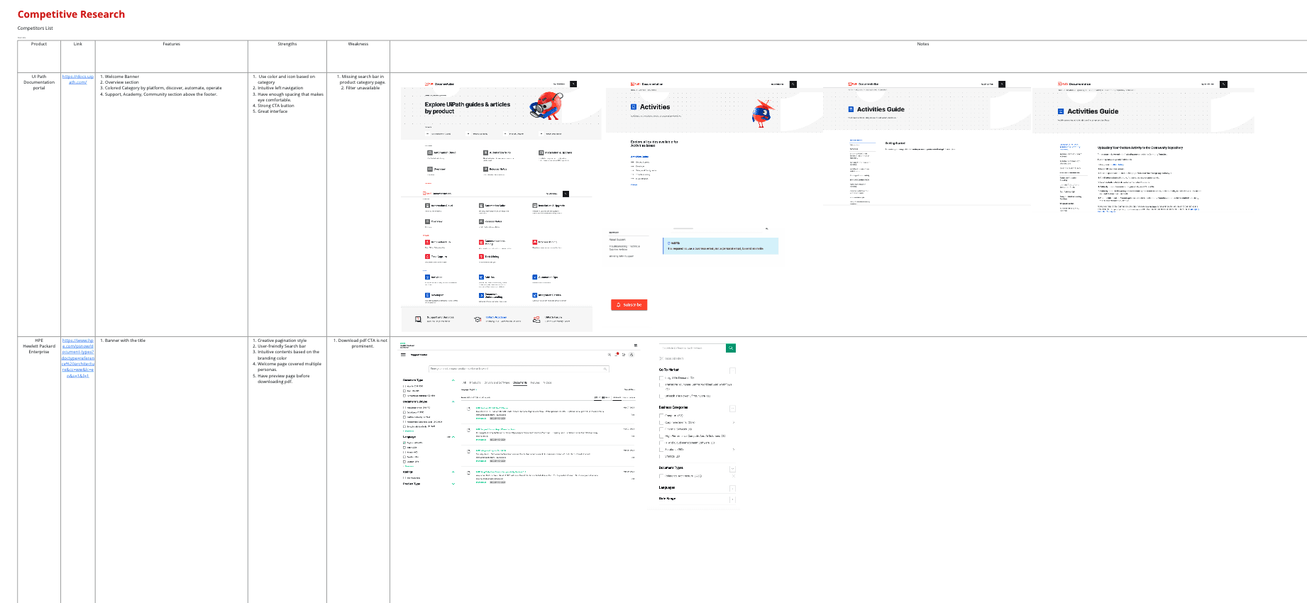 Market research shows competitors use visual banners with CTA buttons for how-to videos, offer search with auto-complete, and follow a simple 3-step journey: homepage, product page, and feature page for easy access to documentation.