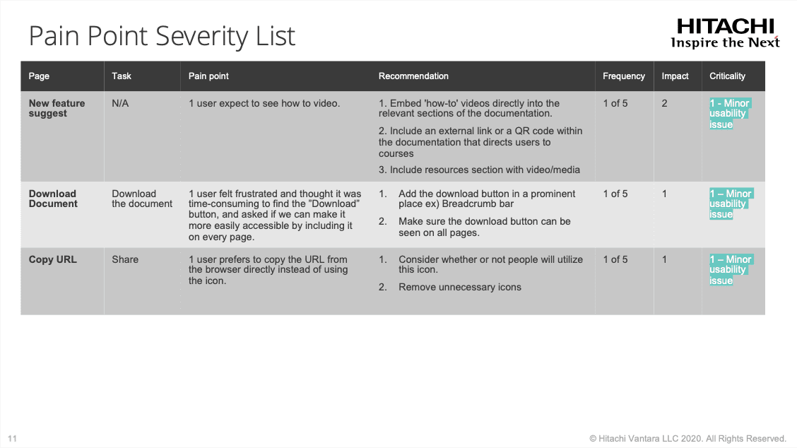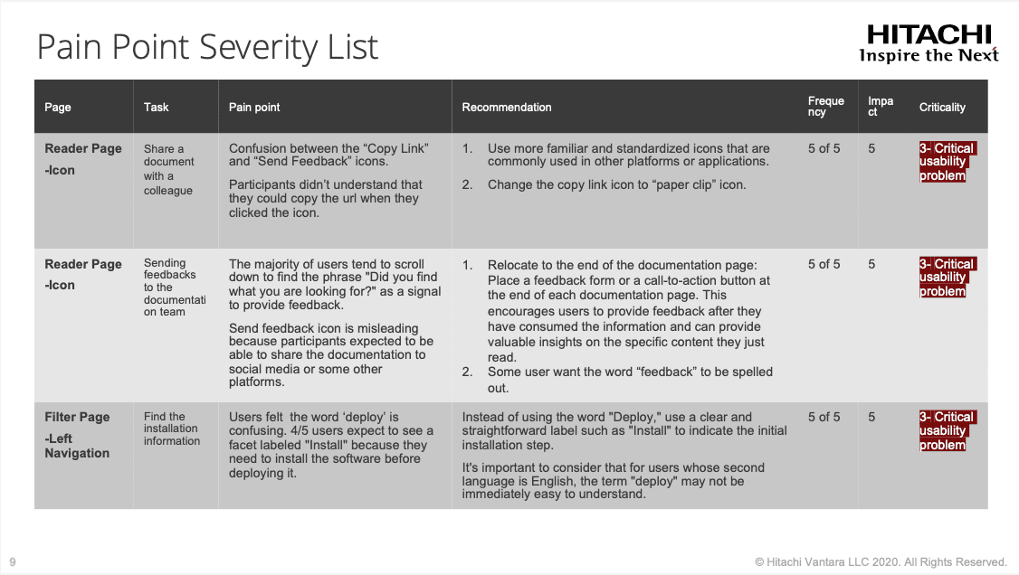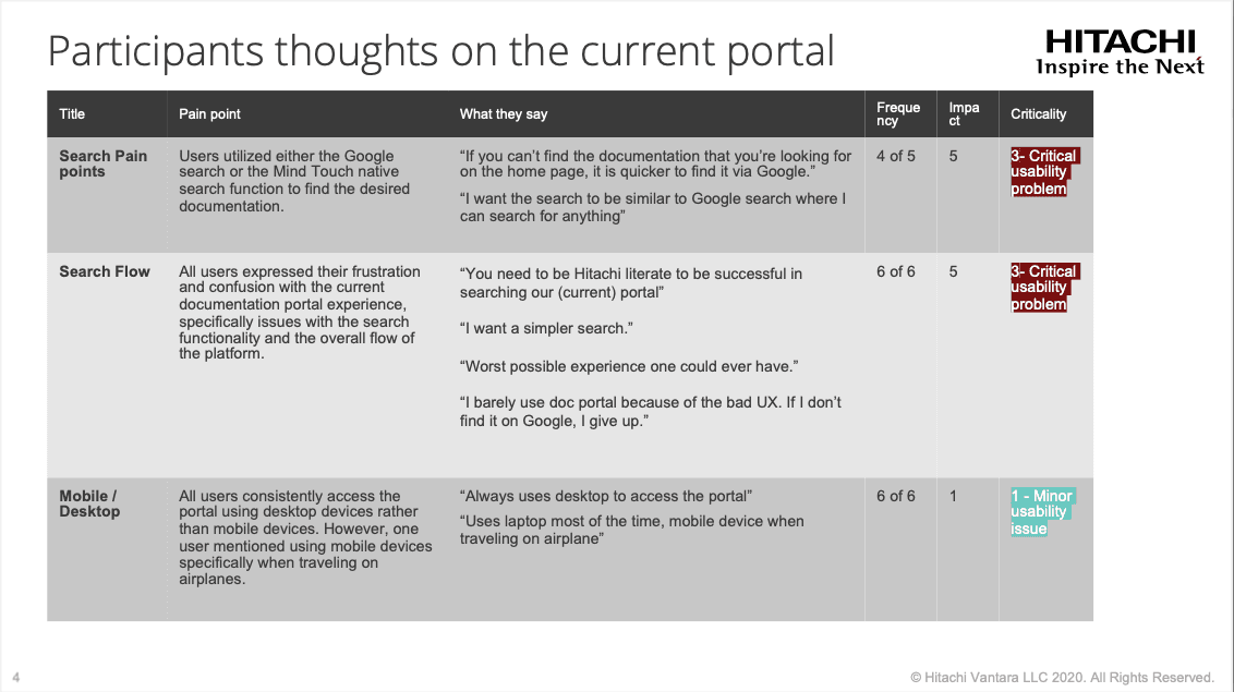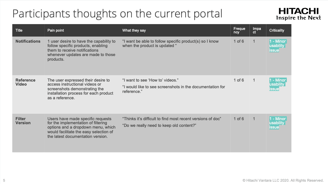 I gathered user feedback by asking for their thoughts on the current state of the documentation portal and categorized responses by severity.
