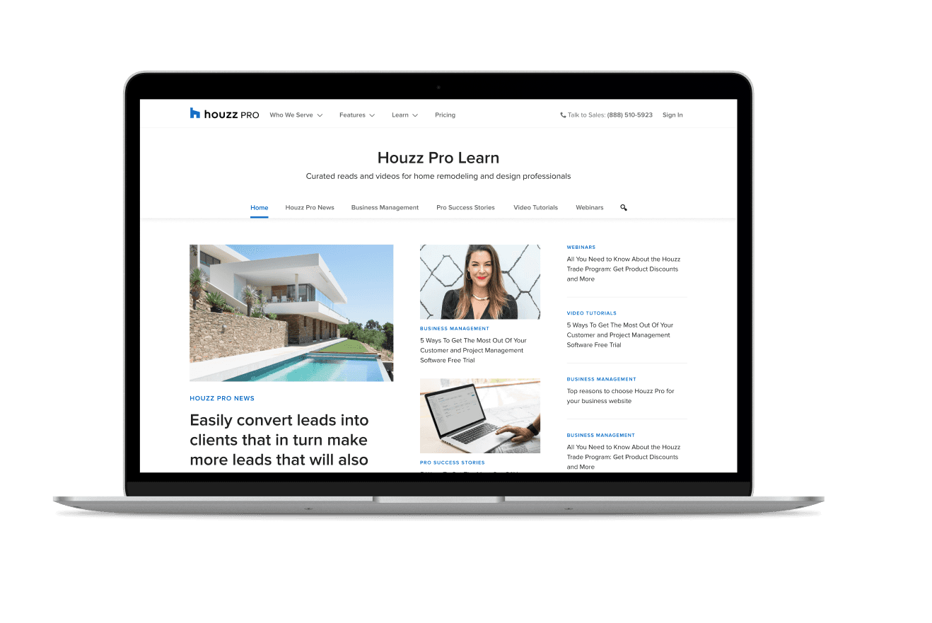 The Houzz Pro webpage offers home remodeling and design professionals access to articles, videos, webinars, and e-books to stay updated on the latest tools and best practices. For the Houzz Pro Learn Site project, I led the redesign of the website, including PR images and web flow for articles, collaborating closely with copywriters. My designs were used across various content, including emails, banners, PR launches, videos, social media, the website, and Learn articles.