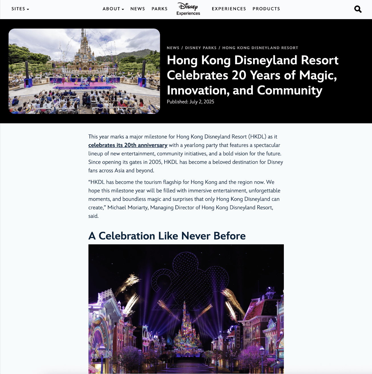 This year marks a major milestone for Hong Kong Disneyland Resort (HKDL) as it celebrates its 20th anniversary with a yearlong party that features a spectacular lineup of new entertainment, community initiatives, and a bold vision for the future. Since opening its gates in 2005, HKDL has become a beloved destination for Disney fans across Asia and beyond.